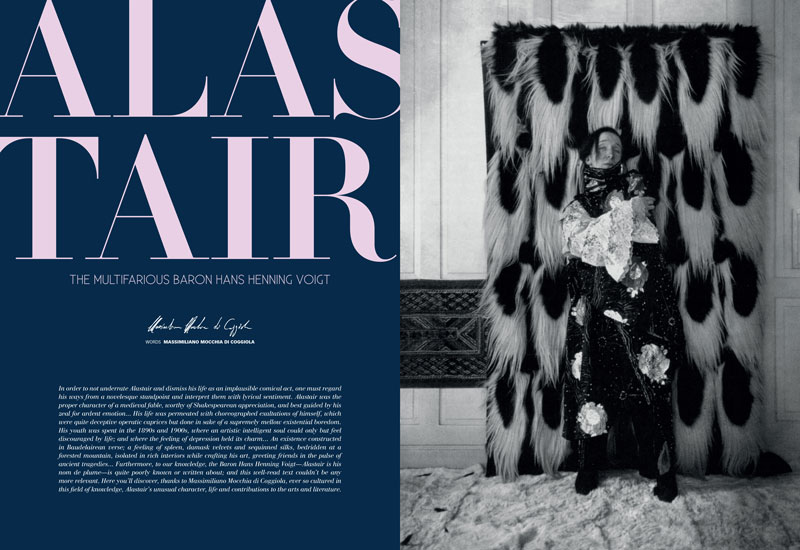 “In order to not underrate Alastair and dismiss his life as an implausible comical act, one must regard his ways from a novelesque standpoint and interpret them with lyrical sentiment. Alastair was the proper character of a medieval fable, worthy of Shakespearean appreciation, and best guided by his zeal for ardent emotion... His life was permeated with choreographed exaltations of himself, which were quite deceptive operatic caprices but done in sake of a supremely mellow existential boredom. His youth was spent in the 1890s and 1900s, where an artistic intelligent soul could only but feel discouraged by life; and where the feeling of depression held its charm... An existence constructed in Baudelairean verse; a feeling of spleen, damask velvets and sequinned silks, bedridden at a forested mountain, isolated in rich interiors while crafting his art, greeting friends in the pulse of ancient tragedies... Furthermore, to our knowledge, the Baron Hans Henning Voigt—Alastair is his nom de plume—is quite poorly known or written about; and this well-read text couldn’t be any more relevant. Here you’ll discover, thanks to Massimiliano Mocchia di Coggiola, ever so cultured in this field of knowledge, Alastair’s unusual character, life and contributions to the arts and literature.”