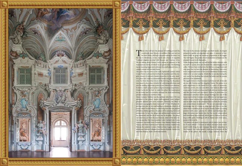 “A visit to the Italian estate and farm shows the accomplishment of the Counts Lechi: a lively, elegant family who takes care of their future as much as of their illustrious past. Accompanying the magnificent photos of Giovanni Cioli, we present a selection of sumptuous trompe-l'oeil draperies and bordures by Zuber.”