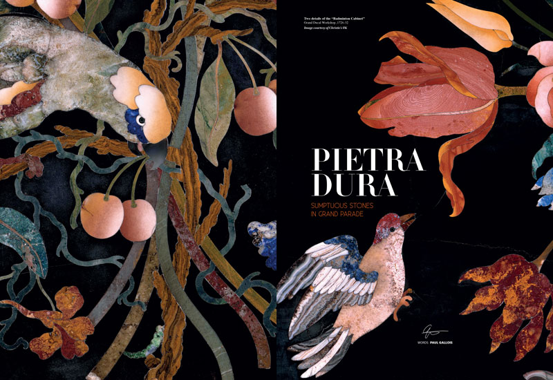 “Masterpieces in pietra dura have been praised and prized by the most influential connoisseurs, from sixteenth-century monarchs to contemporary private collectors. These lapidary pictures were, and still are, skilfully made from thin slices of marble and hardstones such as jasper, porphyry, lapis lazuli, petrified wood and many others. Each small section of stone is sawn very precisely, traditionally using wire charged with abrasive powder, and fitted together. Once united, these jewels from nature create an opulent and captivating feast for the eyes, luxurious pictures that can defy time and that, unlike paintings, never fade.”