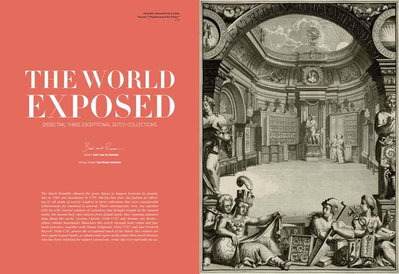 “The Dutch Republic allowed for great things to happen between its foundation in 1581 and dissolution in 1795. During that time, the fashion of collecting by all strata of society resulted in three collections that were considerable achievements for mankind in general. Three contemporary men, one together with his wife, formed cabinets of curiosities that brought insight on the natural world, the human body and cultures from distant lands, thus exposing unknown data about the world. Levinus Vincent (1658-1727) and Joanna van Breda—whose cabinet luxuriously illustrates this article through both realist and fantasist gravures—together with Simon Schijnvoet (1652-1727) and also Frederik Ruysch (1638-1731) proove the exceptional touch of the Dutch. Our readers are once again in good hands, as scholar and expert on the matter Bert van de Roemer, who has been studying the subject extensively, wrote this text especially for us.”