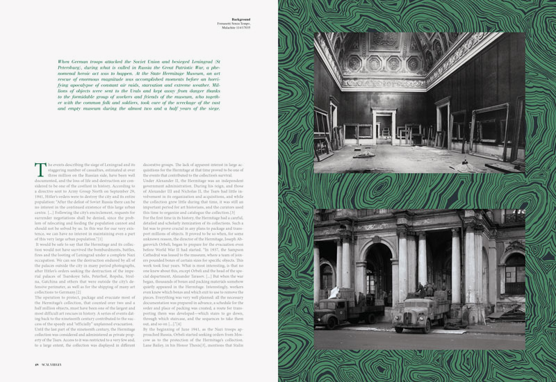 “When German troops attacked the Soviet Union and besieged Leningrad (St Petersburg), during what is called in Russia the Great Patriotic War, a phenomenal heroic act was to happen. At the State Hermitage Museum, an art rescue of enormous magnitude was accomplished moments before an horrifying apocalypse of constant air raids, starvation and extreme weather. Millions of objects were sent to the Urals and kept away from danger thanks to the formidable group of workers and friends of the museum, who together with the common folk and soldiers, took care of the wreckage of the vast and empty museum during the almost two and a half years of the siege.”