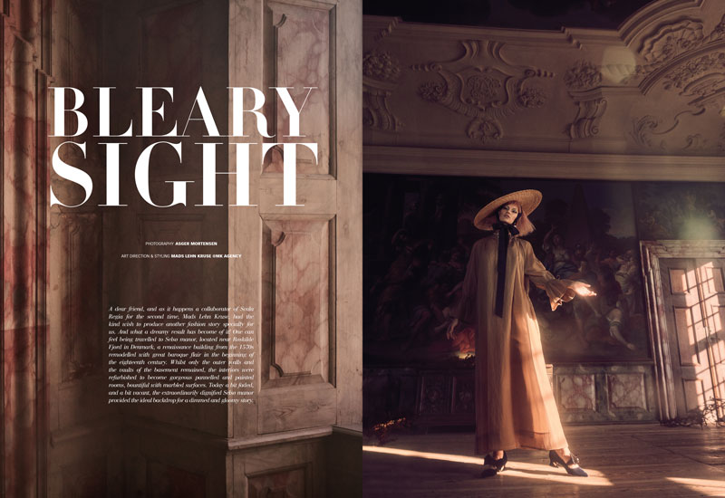 “A dear friend, and as it happens a collaborator of Scala Regia for the second time, Mads Lehn Kruse, had the kind wish to produce another fashion story specially for us. And what a dreamy result has become of it! One can feel being travelled to Selsø manor, located near Roskilde Fjord in Denmark, a renaissance building from the 1570s remodelled with great baroque flair in the beginning of the eighteenth century. Whilst only the outer walls and the vaults of the basement remained, the interiors were refurbished to become gorgeous pannelled and painted rooms, bountiful with marbled surfaces. Today a bit faded, and a bit vacant, the extraordinarily dignified Selsø manor provided the ideal backdrop for a dimmed and gloomy story.”